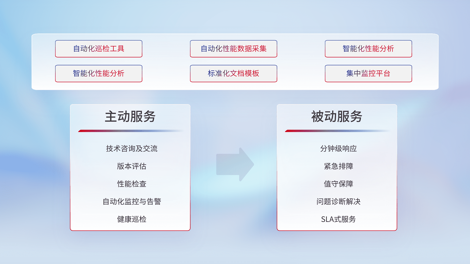 智能化工具和标准化文档,,,保障服务质量,,,提供主动服务(包含技术咨询、、、版本评估、、、性能检查、、、自动化监控与告警、、、、健康巡检)和被动服务包含(分钟级响应、、、、紧急排障、、、、值守保障、、问题诊断解决、、、、SLA服务)。。。